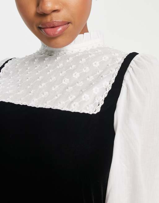 Araminta Mini Dress in Black Velvet with White Lace Detail Very well made.