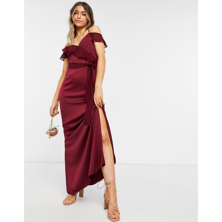 Oasis Bridesmaid ruffle satin maxi dress in burgundy ASOS Very well made.
