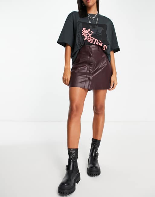 Topshop leather look button through seamed mini skirt in burgundy Very well made.