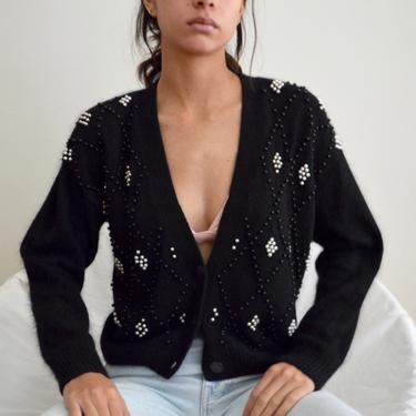 pearl beaded silk and angora blend plunge cropped cardigan Arsenic Kitty Chicago IL Very well made.