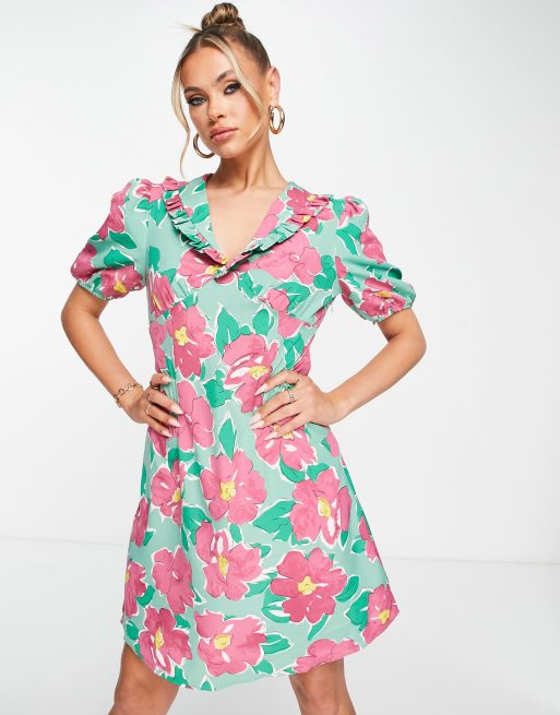 Girl In Mind long puff sleeve mini skater dress in green floral Very well made.
