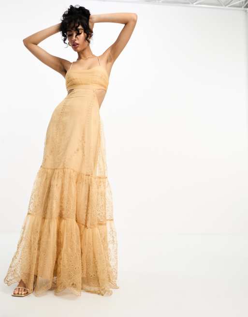 ASOS DESIGN embroidered ruched voile cut out tiered maxi dress in gold ASOS Very well made.