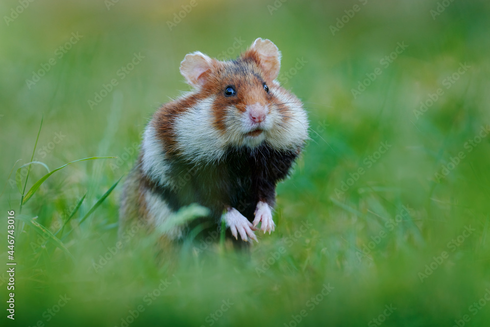 European hamster Cricetus cricetus in meadow grass Vienna Austria. Brown and white Black bellied hamster front view portrait in the nature habitat. Wild cute mouse summer wildlife. Stock Adobe Stock Very well made.