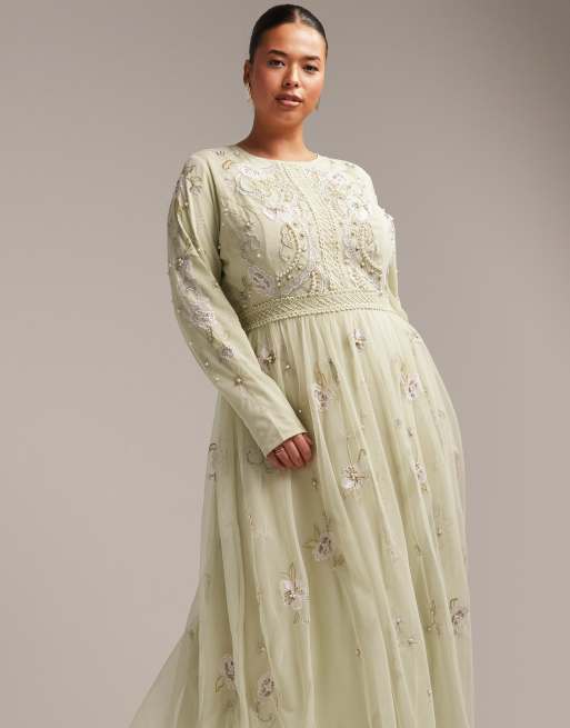 ASOS DESIGN Curve Bridesmaid pearl embellished long sleeve maxi dress with floral embroidery in sage ASOS Very well made.