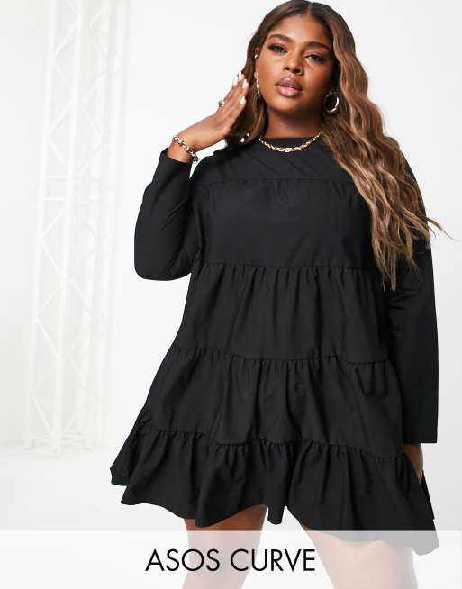 ASOS DESIGN Curve cotton poplin tiered long sleeve mini smock dress in black ASOS Very well made.