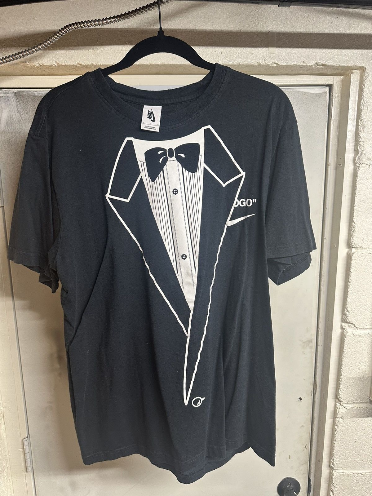 atmos USA on X Nike x Off White NRG A6 Tee is now available in store. The tee featured faux tux screen print with LOGO and Swoosh branding on front and eagle with LOGO Very well made.