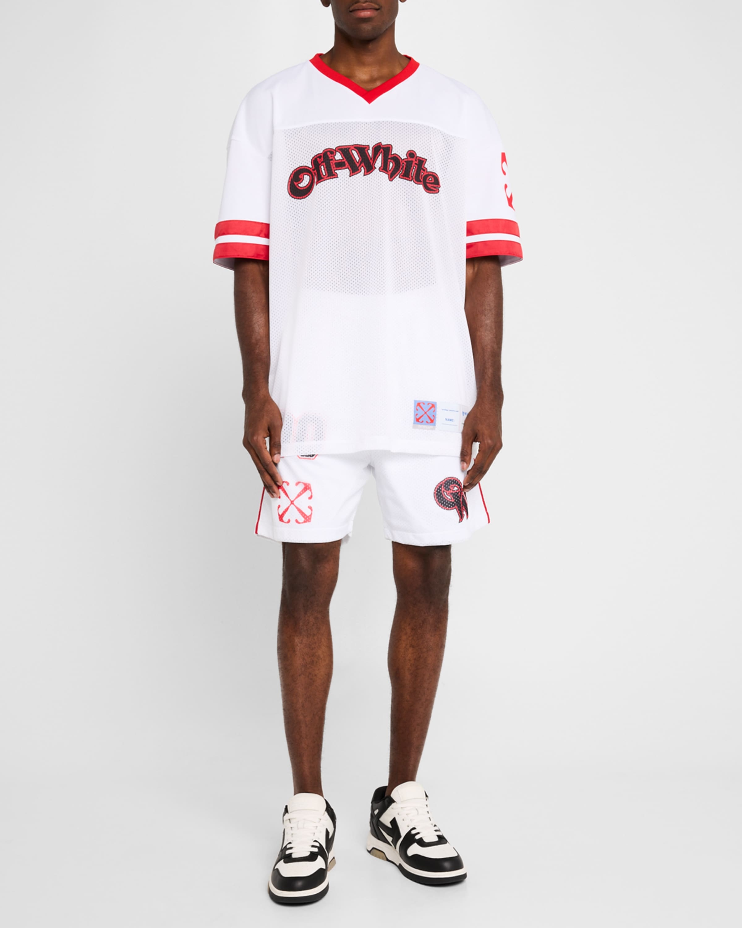 Off White Men s Gothic Logo Football Shorts neimanmarcus REVERSIBLE Very well made.