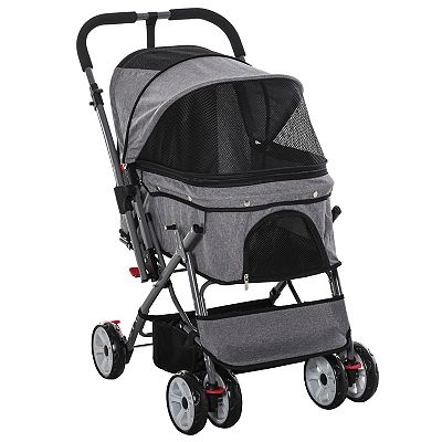 PawHut Travel Pet Stroller One Click Fold Jogger Pushchair with Swivel Wheels Brakes Basket Storage Safety Belts Canopy Brown Very well made.