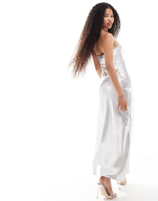 4th Reckless Petite Metallic Satin Bandeau Fishtail Maxi Dress in Metallic Silver Very well made.