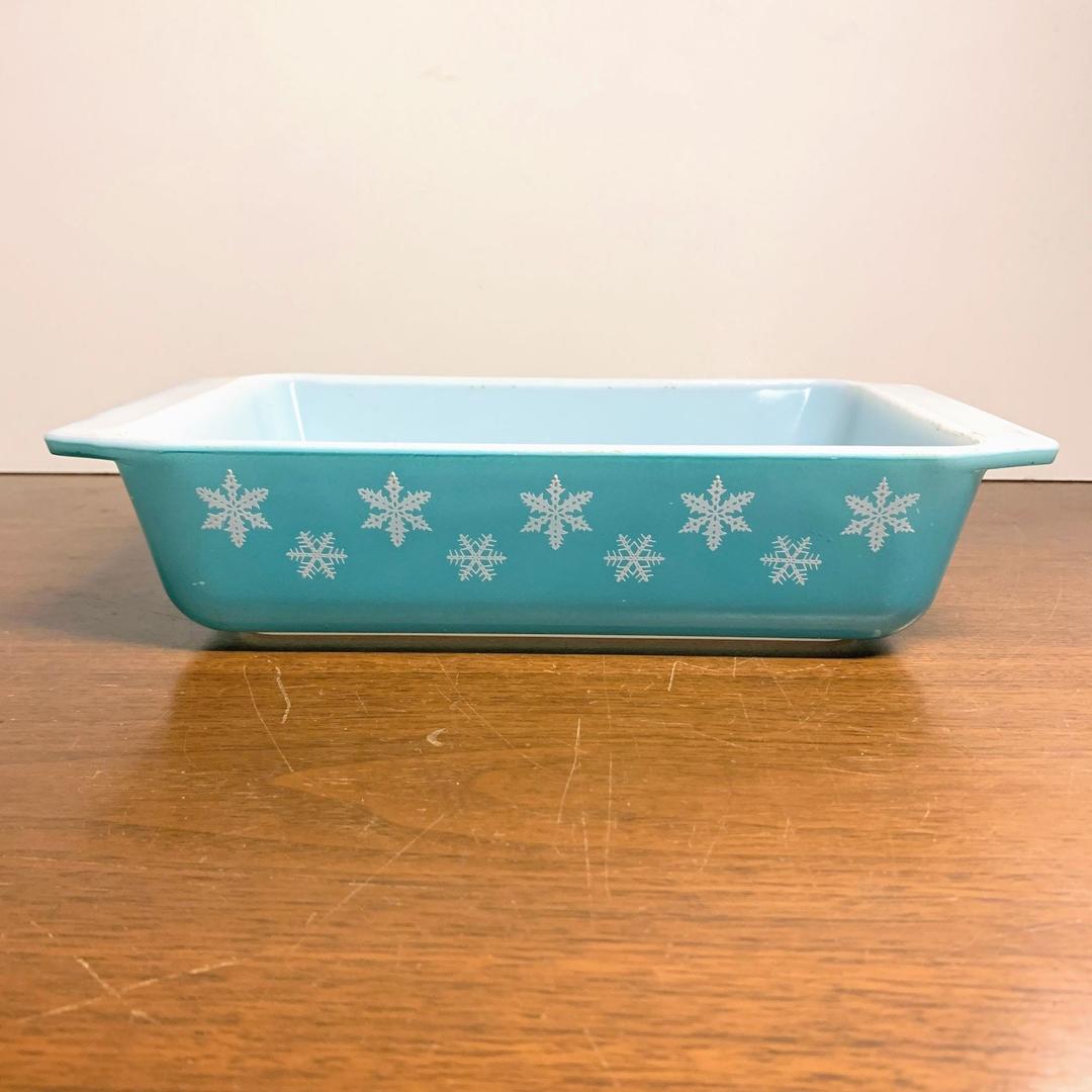Vintage Pyrex White Snowflakes on Turquoise Space Saver Casserole Dish 575 Over the Years Silver Spring MD Very well made.