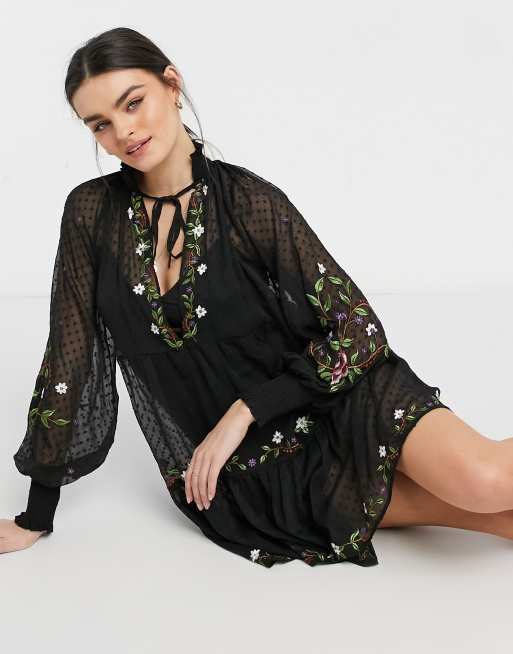 ASOS DESIGN embroidered mini smock dress with shirred cuffs in black Very well made.