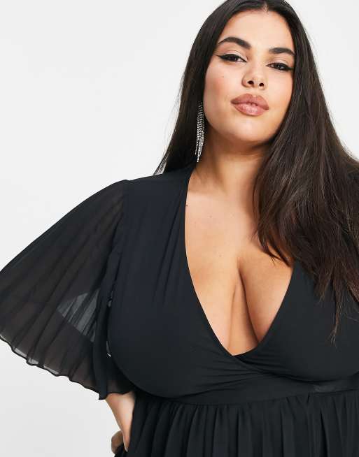 ASOS DESIGN Curve exclusive mini dress with kimono sleeve and tie waist in pleat in black Very well made.