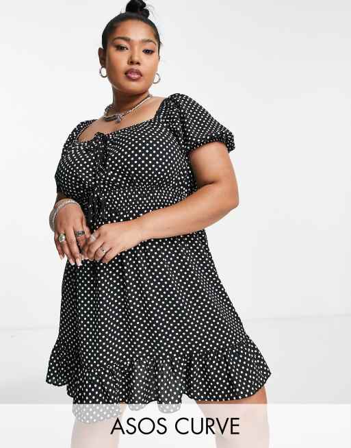 ASOS DESIGN Curve tie front short sleeve mini tea dress in mono dot print Very well made.