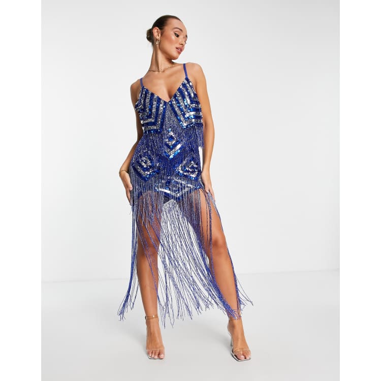ASOS DESIGN fringe embellished padded shoulder mini dress in cobalt blue Very well made.