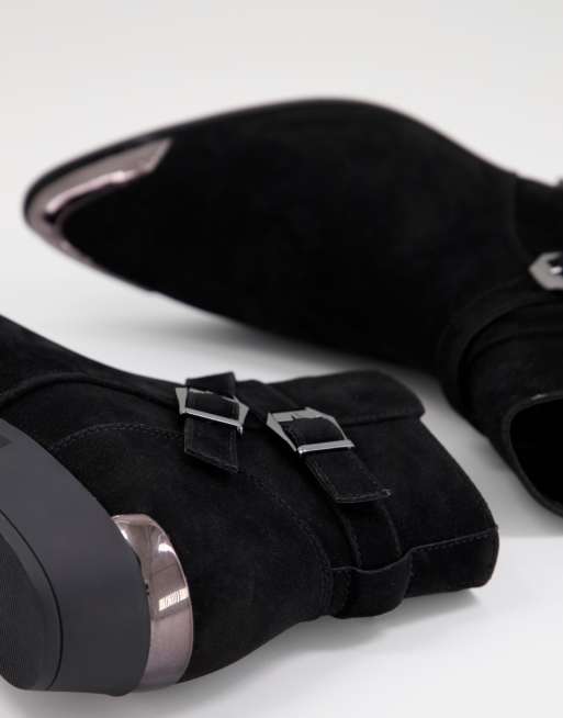 ASOS DESIGN cuban heel western chelsea boots in black faux suede with buckle detail Very well made.