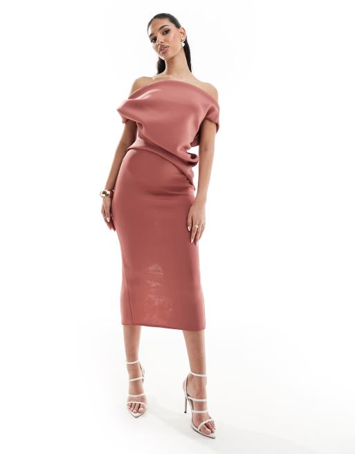 ASOS DESIGN off shoulder pleat waist detail pencil midi scuba dress in rose Very well made.