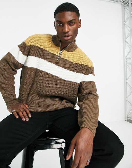 ASOS DESIGN knitted ribbed half zip jumper with colour block chest stripes in tan Very well made.