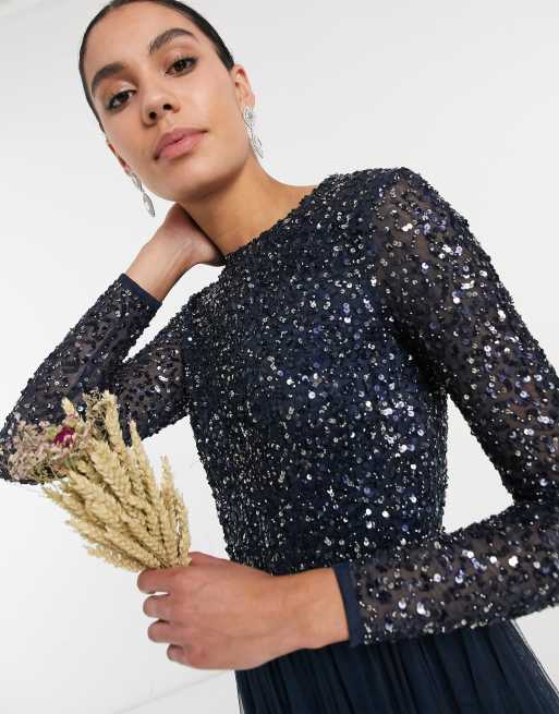Maya Plus Bridesmaid long sleeve maxi tulle dress with tonal delicate sequins in navy ASOS Very well made.