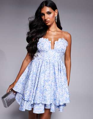 ASOS LUXE jacquard bandeau babydoll mini dress with pleated bust in blue floral print Smart Closet Very well made.