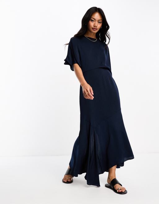 ASOS DESIGN satin flutter sleeve asymmetric hem midi dress in navy Very well made.
