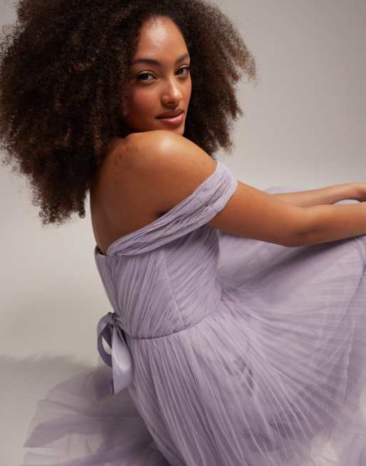 ASOS DESIGN Robe mi longue de demoiselle d honneur en tulle nouee au dos a epaules denudees et jupe plissee Lilas Very well made.