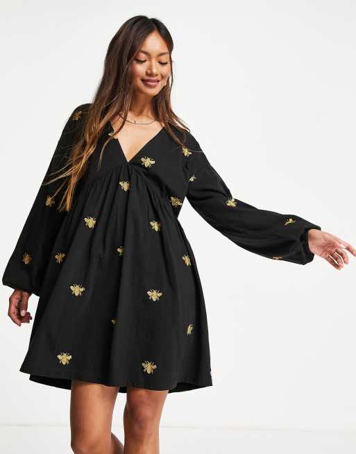 ASOS DESIGN V neck mini smock dress with gold bug embroidery Very well made.