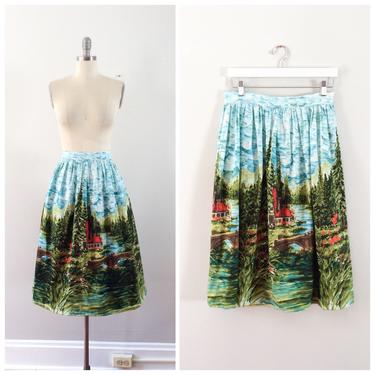 50s Landscape Novelty Print Skirt 1950s Vintage Cotton Full Skirt 30 Chesire Vintage Shop Seattle WA Very well made.