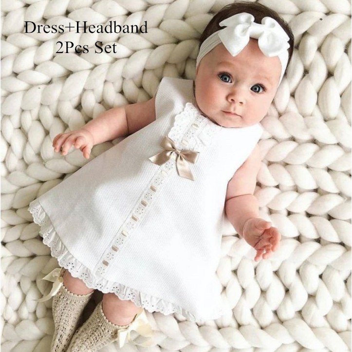 White Dress For Baby Girl 2Pcs Infant Girls Sleeveless Lace Dress with Headband Sets Baptism for 0 24 Months Very well made.