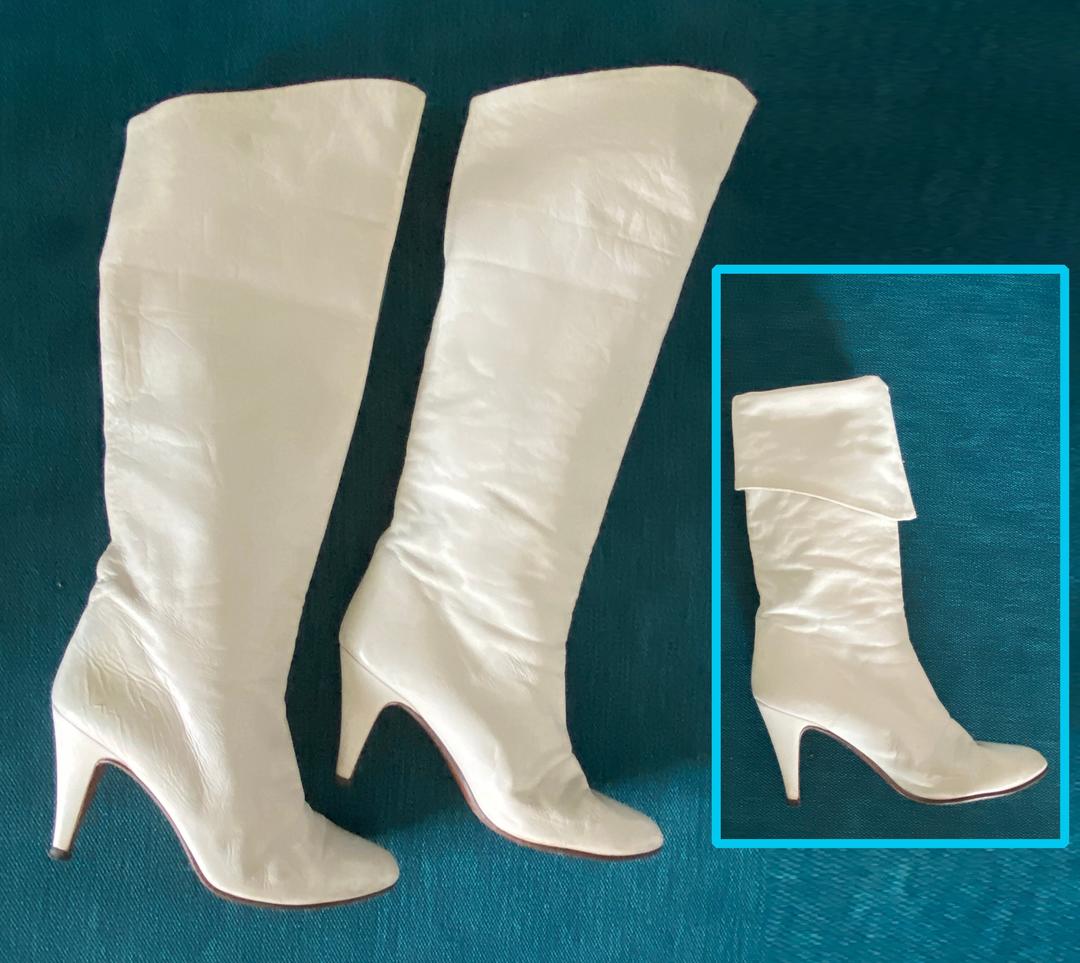 Vintage 80s White Leather Boots High Heel Tall or Cuffed Ellie May Hems Atlanta GA Very well made.